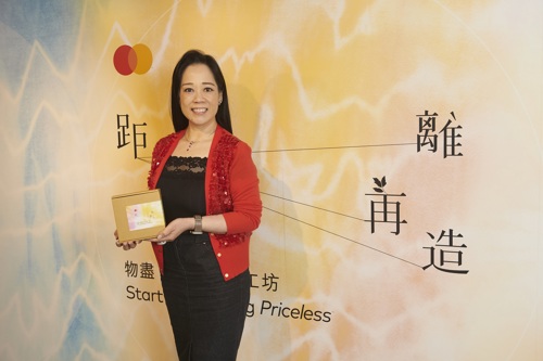 Helena Chen, Managing Director, Hong Kong and Macau, Mastercard, creating a dreamcatcher using tie-dyed repurposed fabric from office supplies in a garment upcycling workshop organized by the company in 2021. All proceeds from the workshop were donated to the Priceless Planet Coalition.