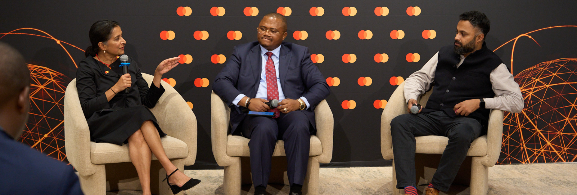 Banner photo, Mastercard Community Pass founder Tara Nathan, left, speaks with Abdulmajid Nsekela, the group CEO and managing director for Tanzania's CRDB Bank, and Aniket Doegar, co-founder and CEO of India's Empowerment Solutions, about building up agricultural ecosystems to transform marginalized countries. (Photo credit: Awa Dia)
