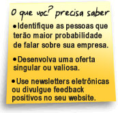 Antes de começar iniciativas para fazer as pessoas conversarem, é importante identificar as pessoas que terão maior probabilidade de falar sobre sua empresa, diz Andy Sernovitz, CEO fundador da Word of Mouth Marketing Association, de Chicago, e autor de Word of Mouth Marketing: How Smart Companies Get People Talking. Em alguns casos o número de pessoas que falam sobre um produto ou serviço sempre será maior que o número de pessoas que o utilizam. Por exemplo, há muito mais pessoas que falam sobre os carros da Ferrari do que as que realmente possuem um, diz Sernovitz.