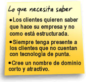Se sorprenderá de cuanta información no entregan algunas pequeñas empresas. Después de todo, no todos los clientes comprarán en línea. Entonces ¿Por qué les dificulta llegar a Ud.? Una casilla de correo electrónico de propósito general puede ser evitada por los clientes quienes se dan cuenta que estas direcciones son frecuentemente ignoradas. "Necesita información de contacto en cada página", dice Demopoulos. "Los clientes potenciales a menudo imprimen páginas que les interesan y, por supuesto, no recuerdan de que sitio Web venían. ¡Facilíteles las cosas!"