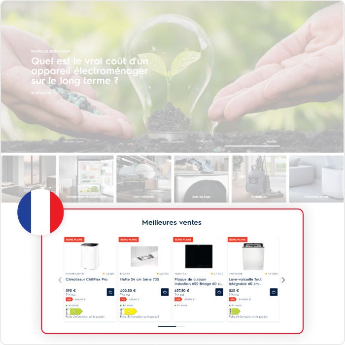 Las experiencias dan cuenta de las diferencias regionales, mostrando un aire acondicionado en Francia (donde era más relevante para la época del año) versus una freidora de aire en Suecia. Además, se aplican diferentes monedas, idiomas y precios. En general, esta campaña de recomendaciones proporcionó sugerencias personalizadas, adaptadas a 63 regiones diferentes que tienen en cuenta las preferencias locales, en 63 dominios de sitios, de manera automática.