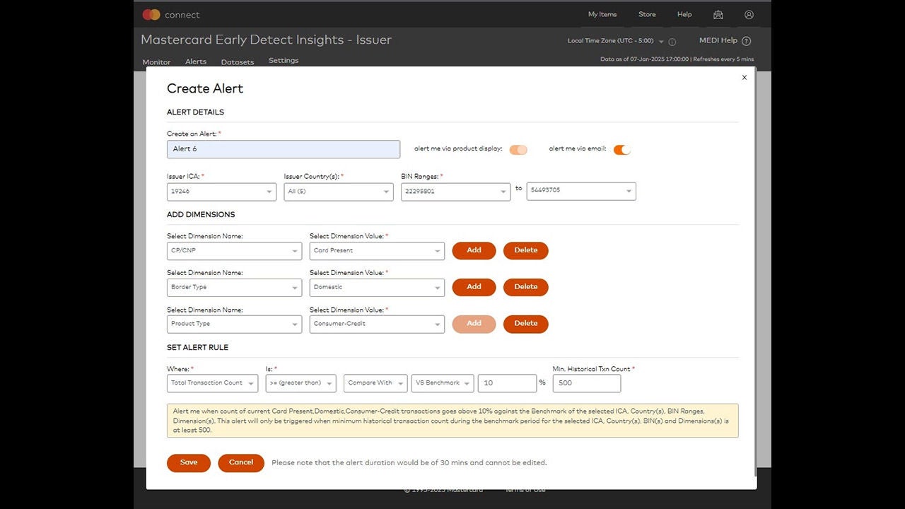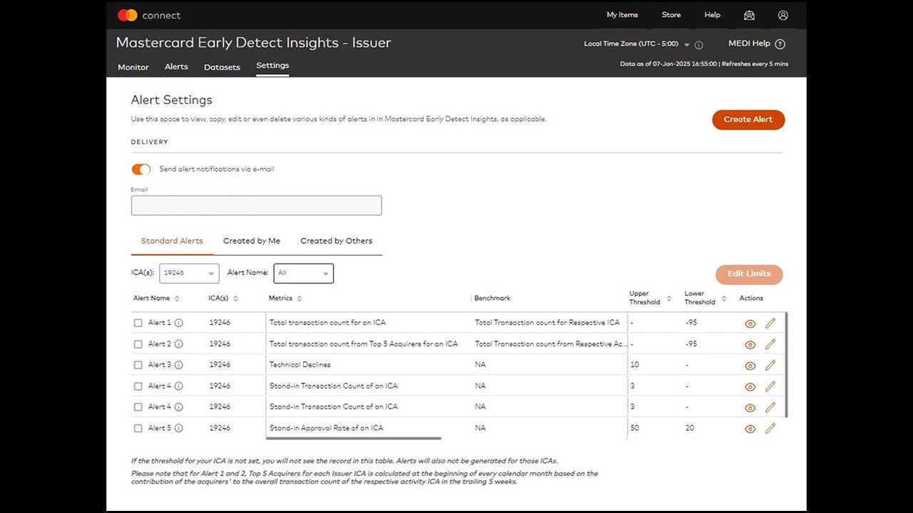 Alerts identifying critical issues ensure prompt investigation through MEDI, while interactive data visualization of authorization and approval-rate performance shortens the time to determine the root cause of avoidable declines.  Within alerts, there is additional capability to ‘Create Your Own Alert’, available alongside the standard Mastercard designed alerts, giving you flexibility and opportunities for personalized investigation.