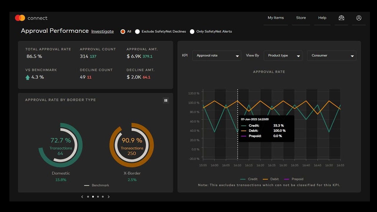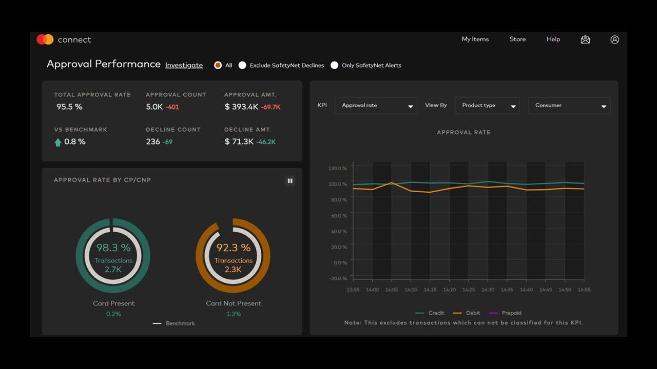 • Users can track KPIs against relevant factors such as card-present (CP) vs card-not-present (CNP), with/without SafetyNet transactions, Responder Type (e.g., Standin), Product Type and 3DS, allowing the user to diagnose problems as they occur