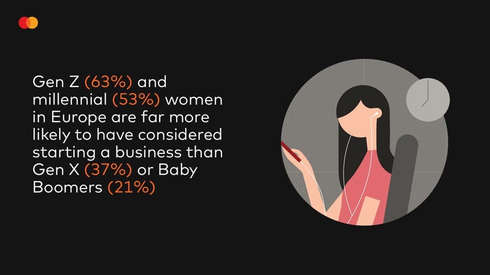 Gen Z women in Europe are most likely to want to start a business to do ‘something good for the world’ (19% vs. 13% millennials, 14% Gen X and 16% Baby Boomers).