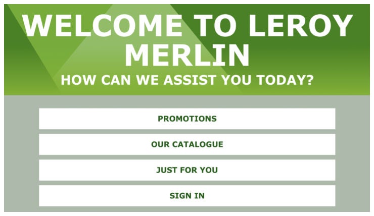 Welcome to Leroy Merlin, how can we assist you today?” banner with options to view current promotions, the product catalogue, personalized recommendations, and to sign into profile.