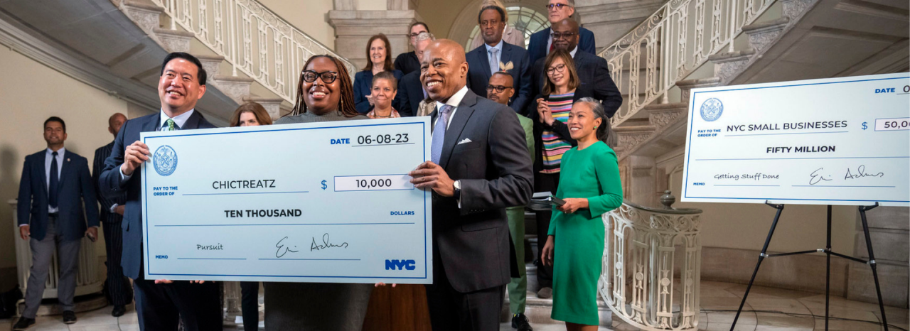 Kevin Kim, left, and New York City Mayor Eric Adams, right, at a June event in which they announced that more than 600 small businesses had received funding from the Opportunity Fund since its inception in January. (Photo courtesy of New York City Department of Small Business Services)