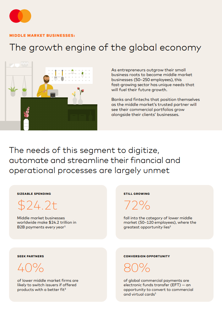 U ovom izvješću identificiramo ključne izazove, potrebe i problematične točke tvrtki srednjeg tržišta te nudimo strateške zaključke za banke i fintech tvrtke koje žele osvojiti veći udio u ovom ključnom, ali često zanemarenom segmentu. Od rastuće potražnje za rješenjima prilagođenim upravljanju novčanim tokom do potrebe za boljom obranom od kibernetičkog kriminala, Mastercard vidi neiskorištenu priliku da pomogne srednjem tržištu da dobije resurse koji su im potrebni za ostvarenje svog punog potencijala.