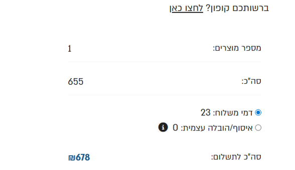 - ברכישה באתר האינטרנט "אפרודיטה" – דמי משלוח הינם בסך 24.90 ₪; משלוח חינם בקנייה מעל 199₪.