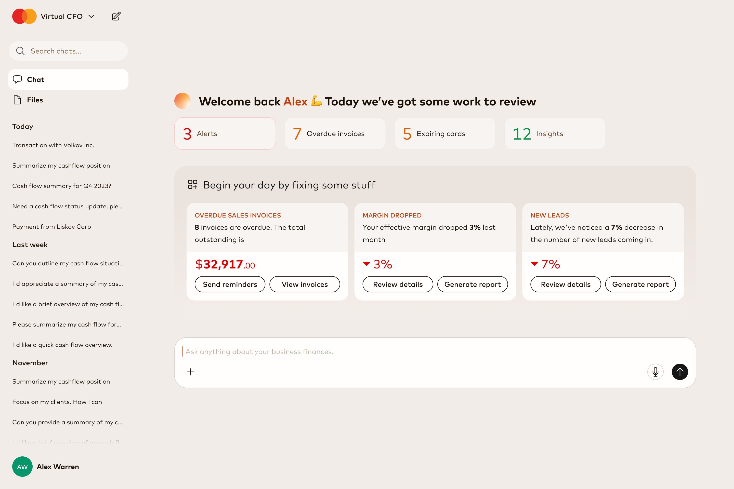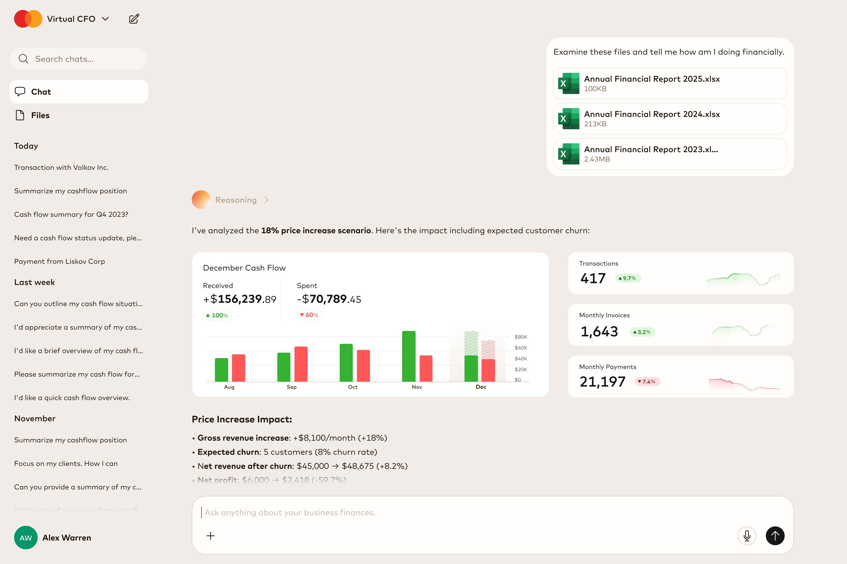 עם תובנות קנייניות ממיליארדי העסקאות המעובדות ברשת של Mastercard מדי שנה - 175 מיליארד בשנת 2025 בלבד - בשילוב עם הפעילות הפיננסית האישית של כל עסק, Virtual C-Suite נועד לספק המלצות רלוונטיות ואמינות לגבי האופן שבו עסקים משלמים, מקבלים תשלום ומנהלים הון חוזר.