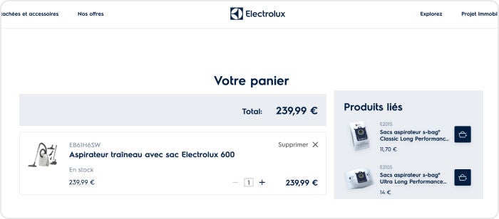 Electrolux ha applicato una logica personalizzata agli algoritmi di Dynamic Yield per consigliare accessori in base agli articoli nel carrello di un utente. Nella prima immagine, una lavatrice nel carrello fornisce consigli per i lavavetri e un filtro in microplastica. Quando si aggiunge un aspirapolvere al carrello (seconda immagine), vengono visualizzati i consigli per i sacchetti sottovuoto.