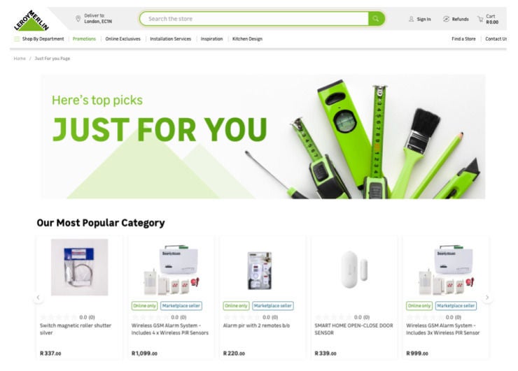 Leroy Merlin Afrique du Sud vend directement des milliers de produits de première partie ; Cependant, ils ont également un marché en ligne sur leur site Web où des produits tiers sont vendus. Près de 70 % des produits disponibles sur leur site web proviennent de tiers. Comme ces produits étaient parfois plus compétitifs en termes de prix que les produits first-party, Dynamic Yield a aidé Leroy Merlin à renforcer la visibilité des produits first-party grâce à des algorithmes de recommandation filtrés.