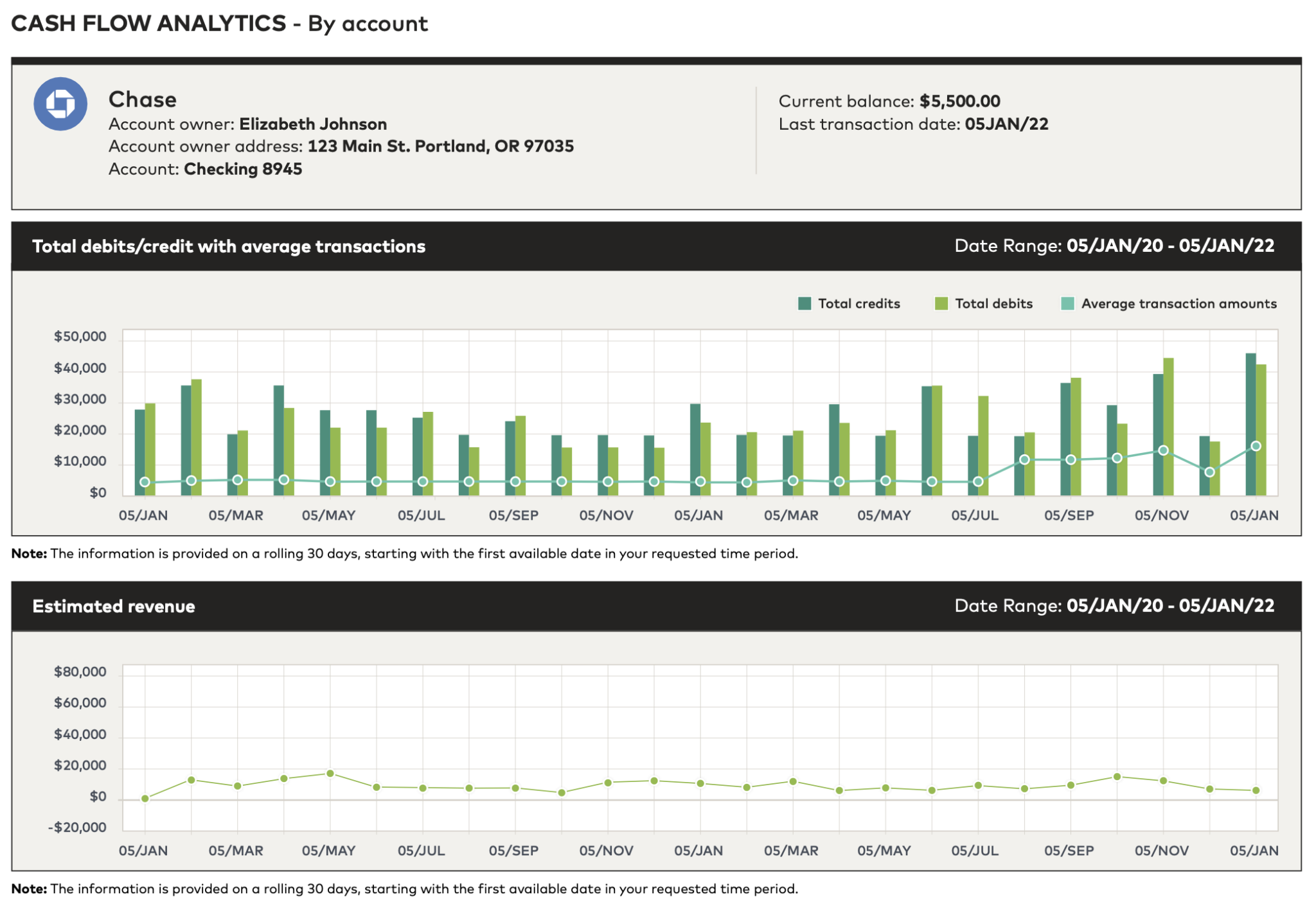 Fluxul de numerar net: suma totală a creditelor minus suma totală a debitelor afișată grafic pentru ultimele 30 de zile, astfel încât punctul din 5 martie reflectă ultimele 30 de zile de credite și debite din cont(uri).