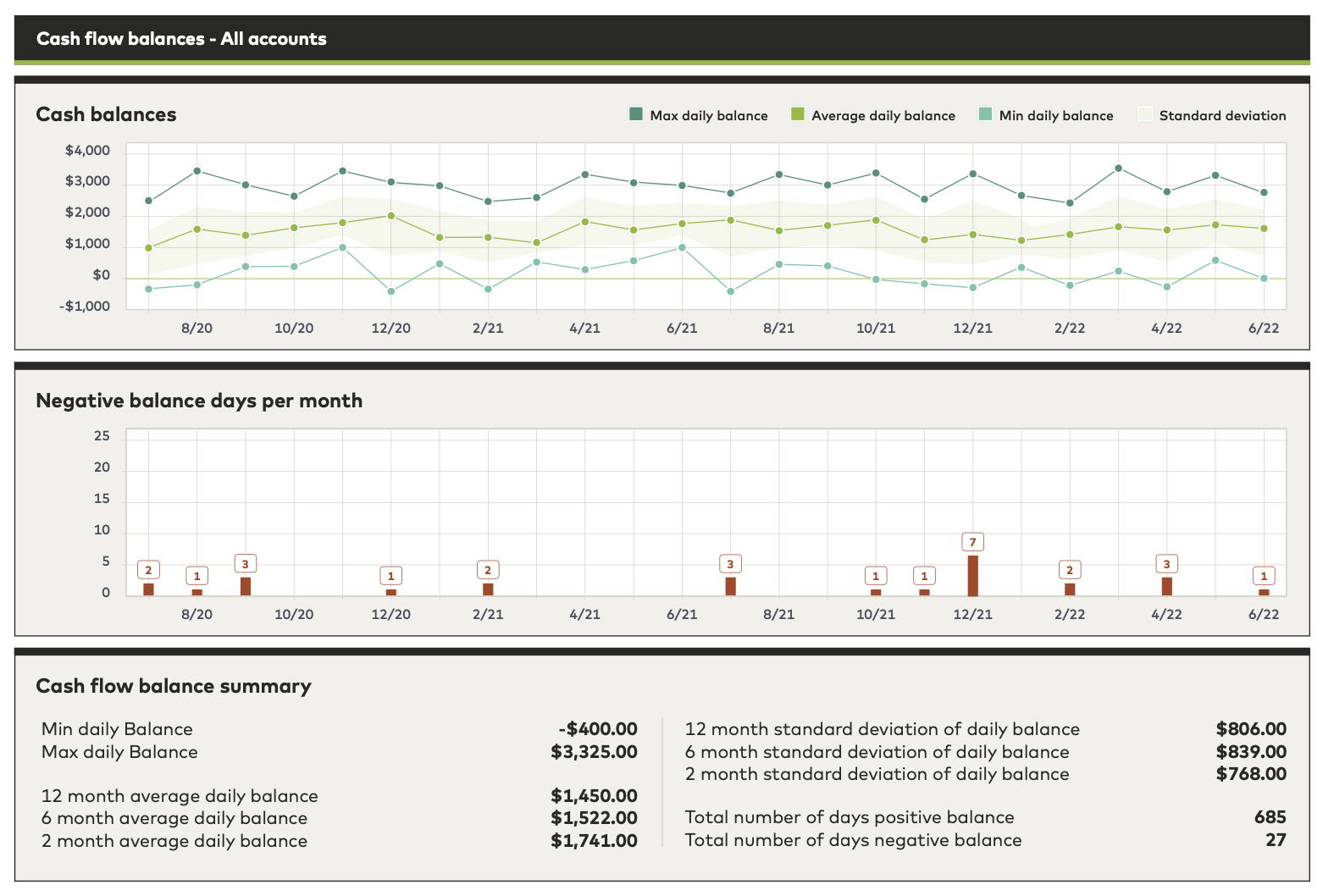 Câmpurile de abatere standard indică cât de mult fluctuează soldul tău față de soldul mediu în acea perioadă. De exemplu, dacă soldul mediu din ultimele 12 luni este de 1.450 USD și abaterea standard pentru aceeași perioadă de 12 luni este de 806 USD, atunci soldul fluctuează între 644 USD și 2.256 USD.