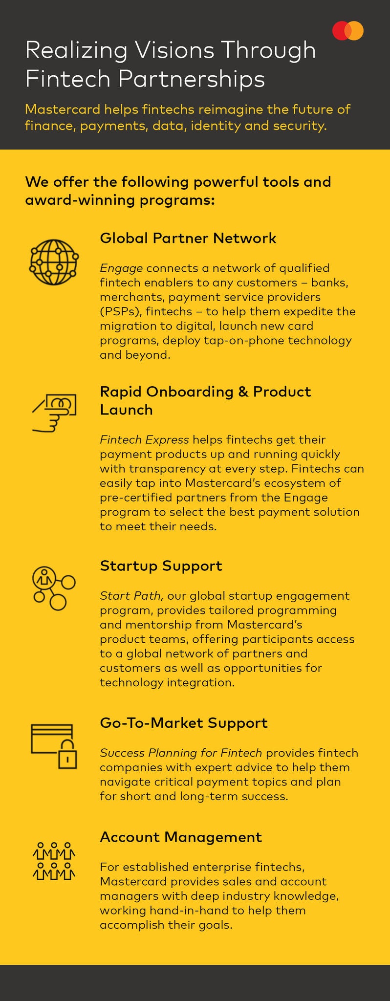 În mod similar, Mastercard Start Path, programul global de implicare a startup-urilor al companiei, oferă programe personalizate și mentorat cu echipele de produs și experții companiei, acces la partenerii și clienții Mastercard din întreaga lume și oportunități de integrare tehnologică. Mastercard a colaborat cu peste 380 de startup-uri din peste 54 de țări prin intermediul programului Start Path. Mai mult de 10 unicorni (adică Companii fintech care au atins o evaluare de 1 miliard de dolari) au apărut în urma programului, inclusiv Airwallex, Razorpay și Revolut.