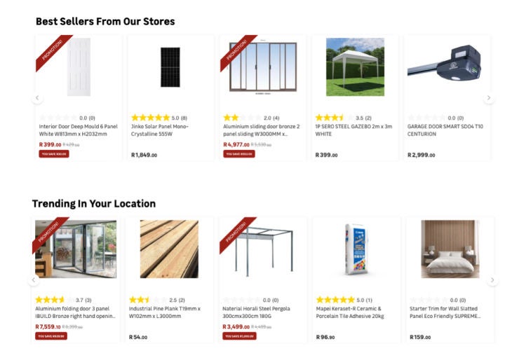 На главной странице Leroy Merlin South Africa бестселлеры и трендовые рекомендации продвигают продукты собственного бренда первого производителя.