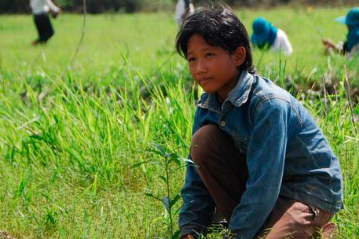A child plants a seedling at a replanting event in a former rice field near Tonle Sap, which has been known as the "fish factory" of Cambodia. But deforestation, climate change, upstream hydropower dams and overfishing have dramatically reduced the region’s fish populations. (Photo credit: Tangkor Dong/Conservation International)