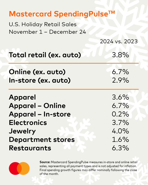 According to preliminary insights from Mastercard SpendingPulseTM, U.S. retail sales excluding automotive increased 3.8% year-over-year from 1 November through 24 December. Mastercard SpendingPulse measures in-store and online retail sales, representing all payment types and is not adjusted for inflation.