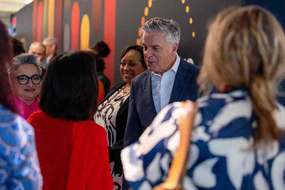 U.S. Commerce Secretary Gina Raimondo, right, speaks with Mastercard's Tara Nathan, the founder of Community Pass, which provides tools and technologies to transform marginalized communities by increasing access to services. (Photo credit: Rebecca Abraham)
