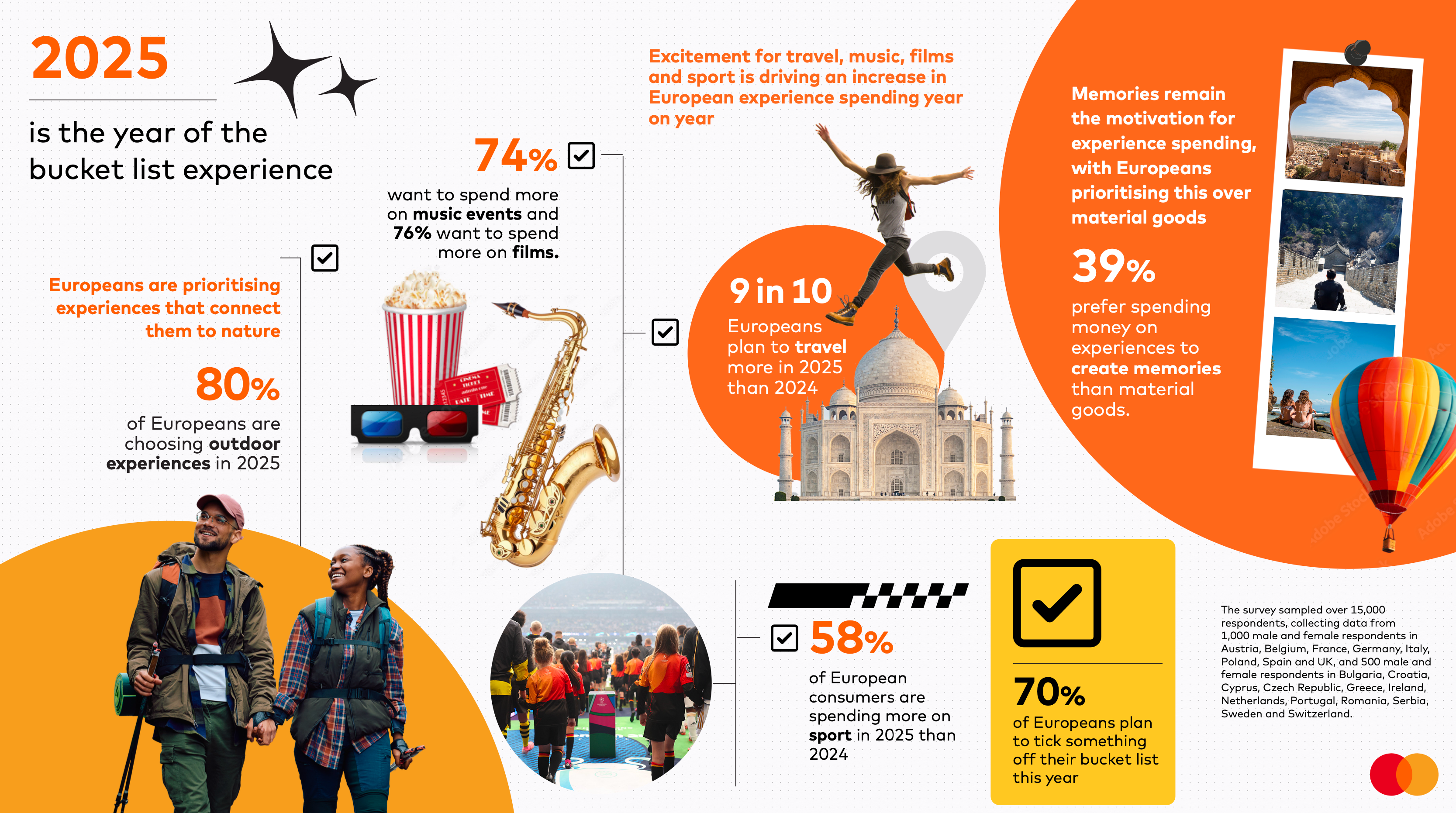 As Europe gears up for another landmark year of unforgettable events—spanning sport, music, and film—annual consumer survey from Mastercard reveals a major shift in spending priorities when it comes to experiences. Two-thirds of consumers are going all in on bucket-list activities, choosing to invest in big-ticket moments to create lifelong memories and gain new perspectives on the world, with travel and tourism leading the way when it comes to consumer spending.