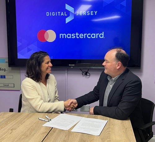 Tony Moretta, CEO of Digital Jersey, and Solveig Honoré Hatton, senior vice president, Government Engagement, Mastercard sign the Digital Country Partnership