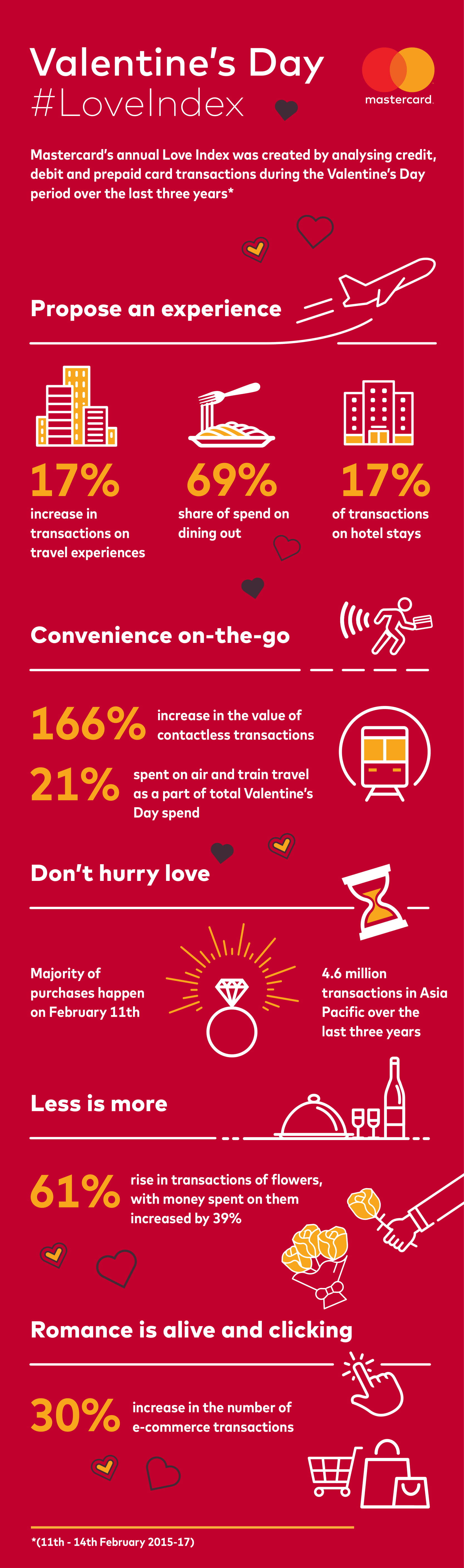 Is romance in Asia Pacific slowing down? Mastercard’s latest Love Index findings suggest otherwise, as sentimental spending in the region has heated up by 22 percent since 2015. Overall transactions during the Valentine’s Day period also shot up by 74 percent over the last three years, indicating Asia Pacific’s consumers are feeling more loved than ever.