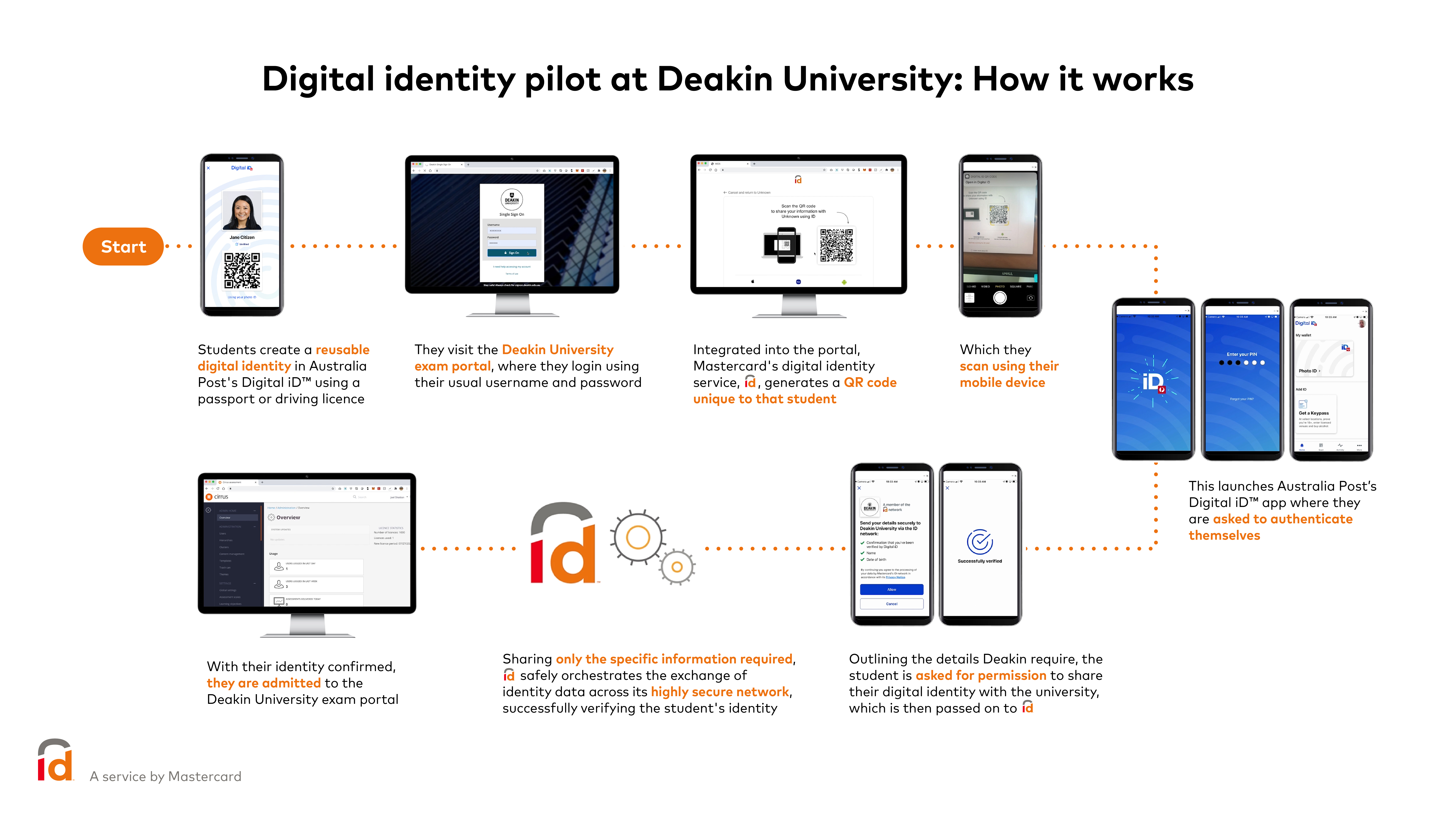 This month, Mastercard, Australia Post and Deakin University expanded tests of ID, Mastercard’s digital identity service, to verify students taking exams online. The platform represents an opportunity to create new ways for people to confirm their identity without having to handover any physical documents when completing an application, accessing benefits, booking accommodations and more.