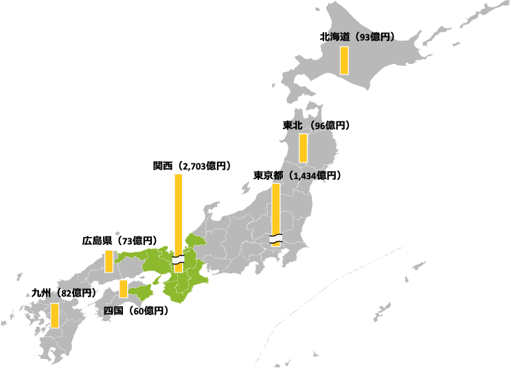 | 関 西 | 870万人 | 9,461億円 | +1,948億円 (+26%) |