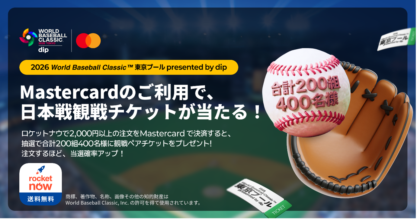 2026年2月10日 | 日本Mastercardは、送料・サービス料無料のフードデリバリーサービス「Rocket Now(ロケットナウ)」と連携し、日本で開催される「2026 World Baseball Classic™ 東京プール presented by dip」を記念したキャンペーンを実施します。