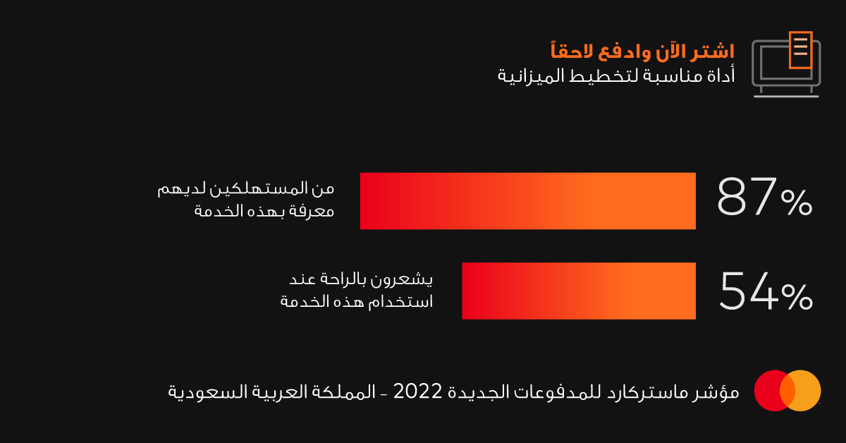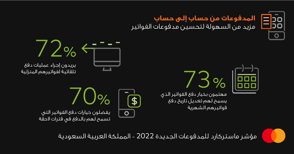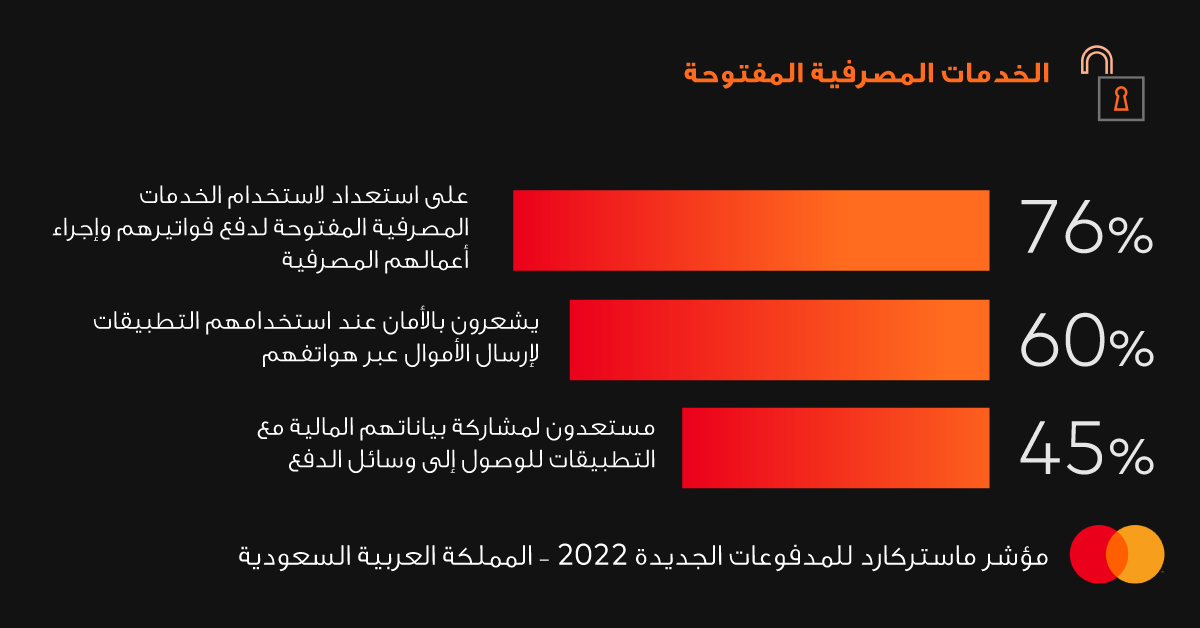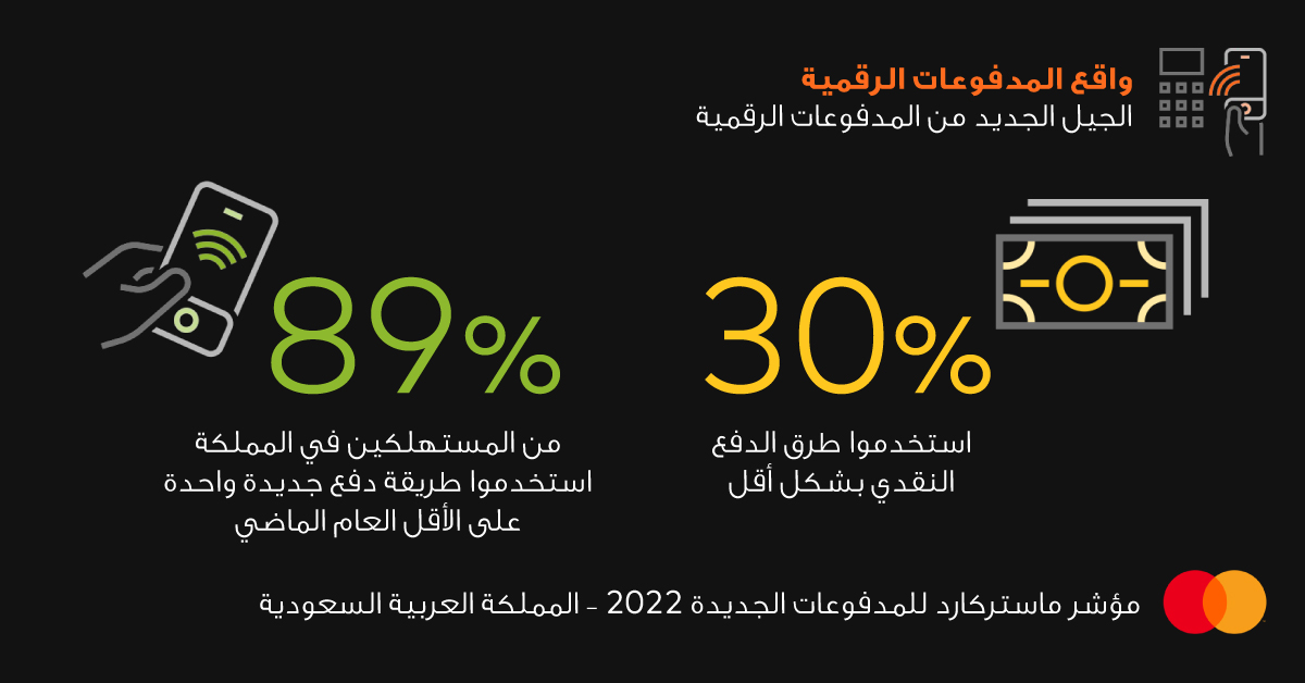 ووفقاً لمؤشر المدفوعات الجديدة 2022 من ماستركارد، استخدم 89% من الأفراد في المملكة العربية السعودية طريقة دفع جديدة واحدة على الأقل خلال العام الماضي، ولجأ 42% منهم إلى الهواتف المحمولة لإجراء عمليات الدفع اللاتلامسية، واستخدم 31% تطبيقات تحويل الأموال الرقمية، بينما اختار 21% خطط سداد خدمة "اشتر الآن وادفع لاحقاً". ويعمد المستهلكون بشكل متزايد إلى إجراء عمليات الشراء بطرق متنوعة، تشمل الاعتماد على المساعد الصوتي وتطبيقات التواصل الاجتماعي.