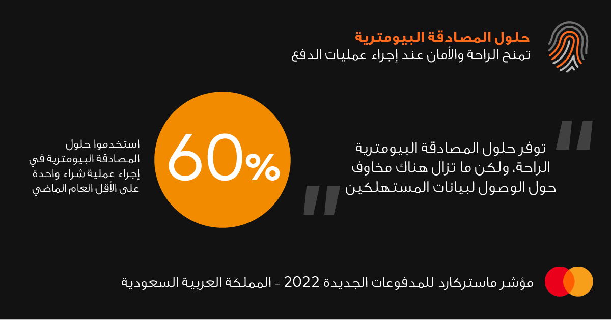 ورغم المخاوف التي تعتري بعض المستهلكين بشأن الجهات التي يمكنها الوصول إلى البيانات البيومتيرية الخاصة بهم، إلا أنهم ما زالوا منفتحين على استخدامها نظراً لما توفره من وقت، وأكد أكثر من نصف المستهلكين (60%) استخدامهم لحلول المصادقة البيومترية في إجراء عملية شراء واحدة على الأقل العام الماضي. واستخدم 5 من كل ستة مستهلكين (85%) أو يخططون لاستخدام بصمات أصابعهم لإجراء عمليات الدفع، والتي تبعتها طرق بيومترية أخرى مثل التعرف على الوجه، ومسح شبكية العين.