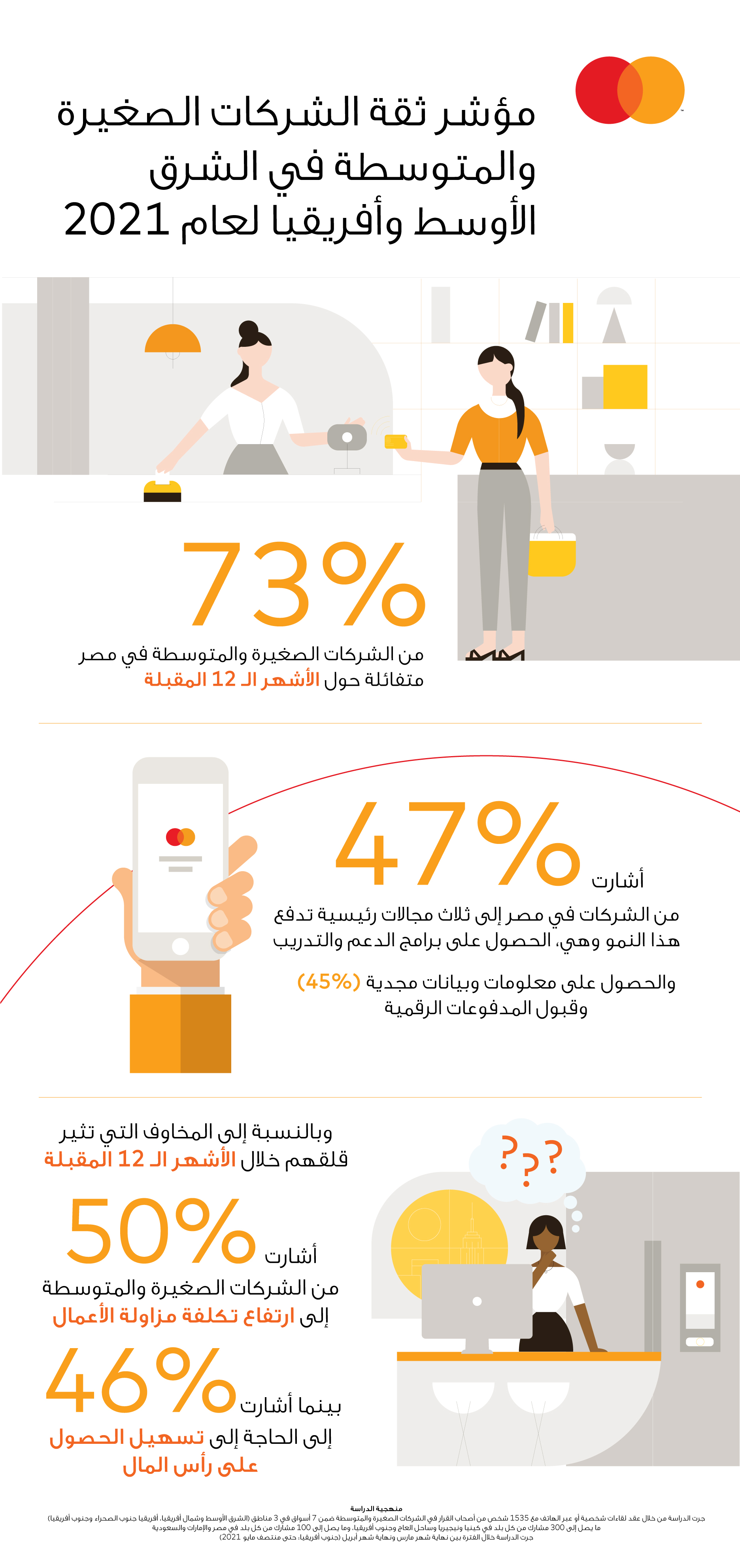 صر 27 يونيو 2021 – كشفت دراسة حديثة أجرتها ماستركارد عن تنامي ثقة الشركات الصغيرة والمتوسطة في مصر، لا سيما بعد التغييرات الصعبة وغير المسبوقة التي فرضها تفشي وباء كوفيد-19. ووجد مؤشر ثقة الشركات الصغيرة والمتوسطة في الشرق الأوسط وأفريقيا، في نسخته الأولى، بأن 73% من الشركات الصغيرة والمتوسطة في مصر تتطلع بإيجابية للأشهر الـ 12 المقبلة، حتى أن 85% من هذه الشركات تتوقع استقرار أو نمو إيراداتها خلال هذه الفترة، بينما توقعت أكثر من ثلثي هذه الشركات (68%) زيادة إيراداتها.