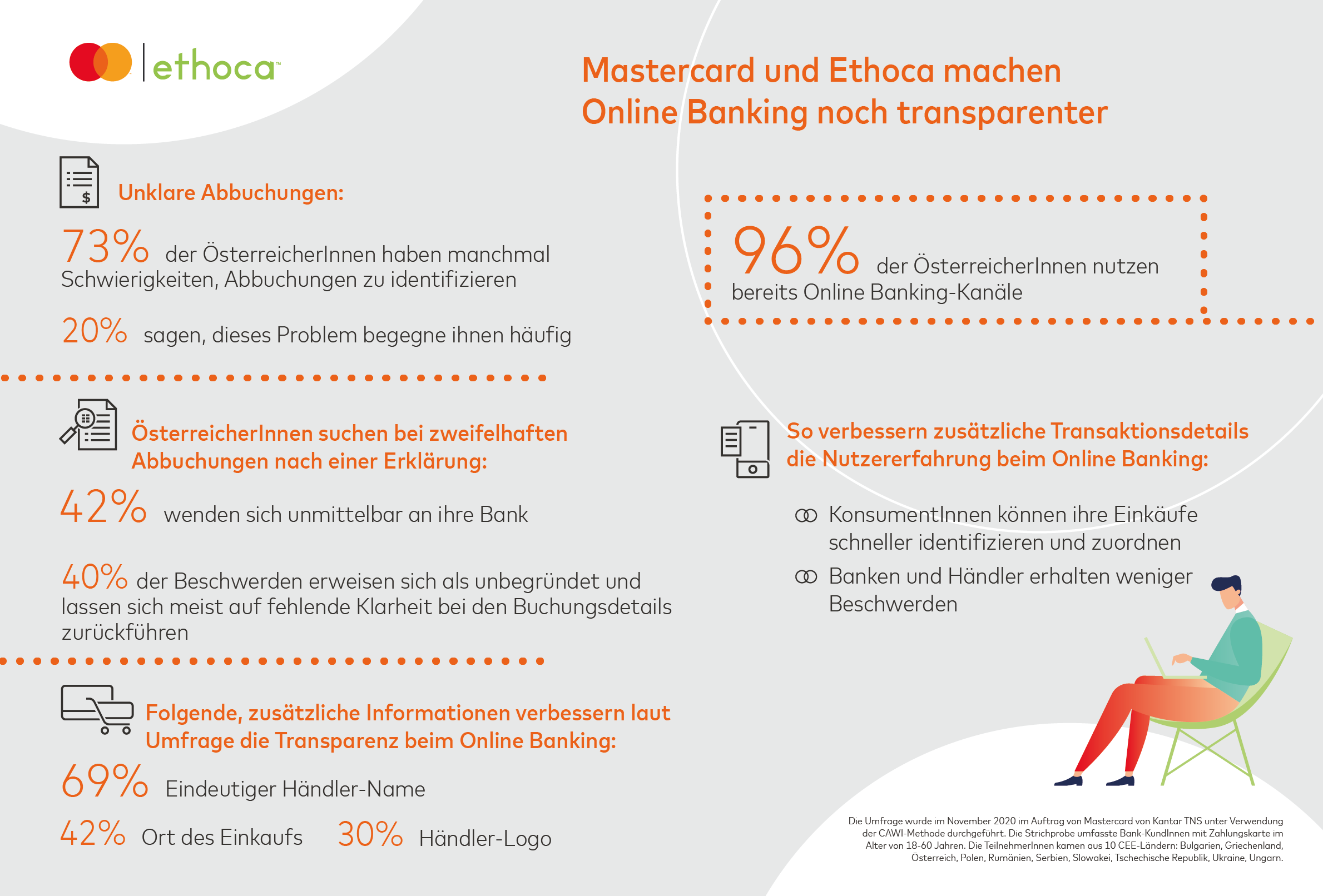 Mastercard hat gemeinsam mit Ethoca* ein Produkt entwickelt, das Online Banking noch transparenter werden lässt. Durch die Ergänzung zusätzlicher Transaktionsdetails wie Händler-Namen, -Logos und genauem Ort des Einkaufs können Kartentransaktionen besser identifiziert und einem Einkauf zugeordnet werden. Die Initiative adressiert ein bekanntes Problem: Laut aktuellen Studienergebnissen1 ist digitales Bezahlen aufgrund der flexiblen und schnellen Handhabung in Österreich sehr beliebt. Gleichzeitig berichtet eine große Mehrheit der Befragten davon, gelegentlich Schwierigkeiten bei der Erkennung von Buchungen in ihrer Kartenabrechnung zu haben – insbesondere dann, wenn anstelle des Händlers ein Zahlungsabwickler angeführt wird.