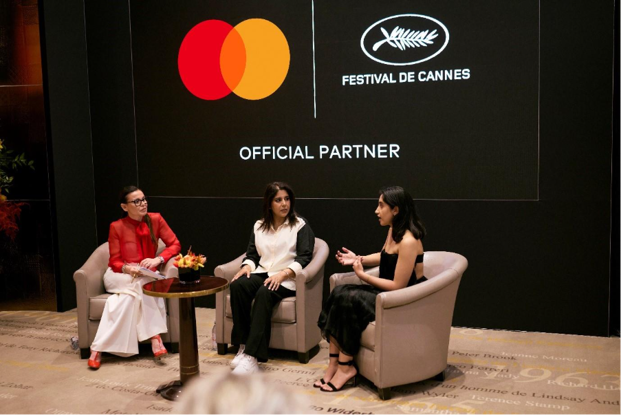 V.l.n.r.: Beatrice Cornacchia, EVP Marketing und Kommunikation APEMEA bei Mastercard, Nisha Ganatra, kanadische Filmschauspielerin und Regisseurin, und Ambika Mod, Schauspielerin und Comedian