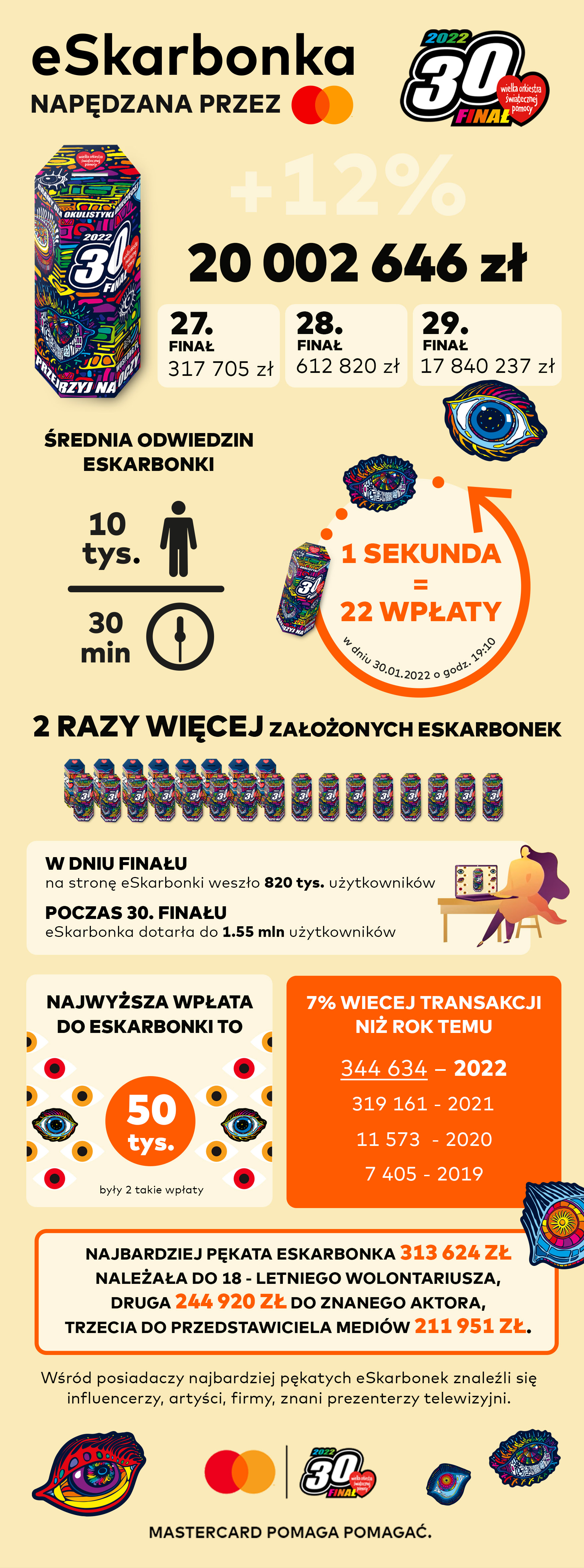 W tym roku po raz piąty Mastercard umożliwił wpłaty na rzecz Fundacji za pośrednictwem eSkarbonek, czyli „wirtualnych puszek”. Mogli je zakładać zarówno prywatni wolontariusze, jak i firmy, instytucje czy organizacje. Wystarczyło w prosty sposób wygenerować i udostępniać w sieci unikalny link do własnej eSkarbonki, za pomocą którego darczyńcy wpłacali darowizny z wykorzystaniem bezgotówkowych płatności online. eSkarbonki, napędzane przez Mastercard, uruchomione zostały na początku grudnia i działały do poniedziałkowego wieczoru, 31 stycznia. Już kolejny rok ta metoda wsparcia WOŚP okazała się niezwykle potrzebna, umożliwiając zarówno wolontariuszom, jak i darczyńcom, przyłączenie się do zbiórki bez wychodzenia z domu. O popularności tego narzędzia najlepiej świadczy fakt, że w tym roku liczba eSkarbonek podwoiła się – założono ich blisko 42 tys., a zebrana do eSkarbonki kwota – 20 mln zł jest wyższa o 12 procent w stosunku do ubiegłego roku. Ostateczna suma może jeszcze się zmienić, ponieważ nadal księgowane są ostatnie wpłaty. Do eSkarbonek dorzuciło się blisko 345 tys. pomagających – o 7% więcej niż w poprzednim roku i 46 razy więcej niż w pierwszym roku uruchomienia tego narzędzia. W dniu tegorocznego Finału w szczytowym momencie odnotowano nawet 22 wpłaty na sekundę. Najwyższa jednorazowa wpłata do eSkarbonki wyniosła 50 tys. zł. Z kolei najbardziej pękata eSkarbonka z kwotą 313 624 zł należała do 18-letniego wolontariusza, druga z kwotą 244 920 zł do znanego aktora, a trzecia z kwotą 211 951 zł do firmy z branży mediowej.