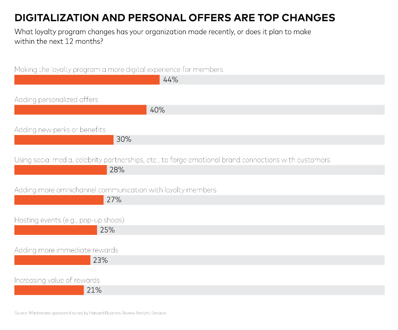 - Become digital-first: Of respondents whose companies recently made changes to their loyalty strategy or are planning changes within the year, the top reason was to create a more digital experience (44%).