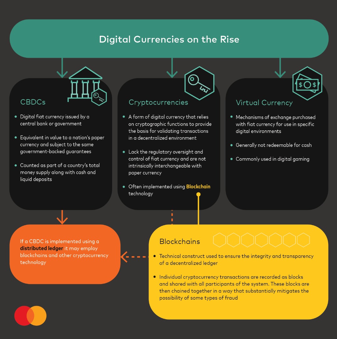 As more aspects of our lives are becoming virtual, the form and functionality of money is changing too. Digital currencies – a broad category of assets – have been garnering great interest in recent years. But with many competing technologies, value propositions and intended use cases, it is important to understand the differences between these new mechanisms of exchanging value. Central Bank Digital Currencies (CBDCs) – digital fiat currencies issued by central banks, for example – are often discussed in the context of blockchain and cryptocurrency, but the terms are not interchangeable.