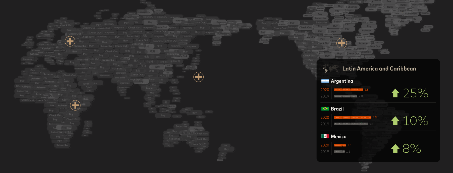 - Los consumidores aumentan su huella en el comercio electrónico, comprando hasta un 30% más en comercios en línea: como reflejo de la mayor capacidad de elección de los consumidores, nuestro análisis muestra que los consumidores de todo el mundo están comprando en un mayor número de sitios web y mercados en línea que antes. En Latinoamérica, los consumidores de países como Argentina compran un 25% más en tiendas en línea. En Brasil, los consumidores compran en un 10% más en tiendas en línea y los mexicanos compran en un 8% más en tiendas en línea.