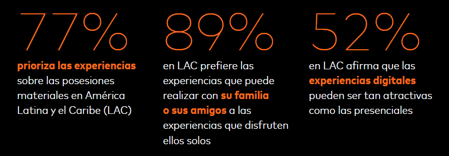 Disfrutar de buena compañía y de buenos momentos con los seres queridos es una prioridad para las personas, pues casi tres cuartas partes afirman que hacen un verdadero esfuerzo por reservar tiempo para disfrutar con amigos y familiares, asegurando que una experiencia es verdaderamente “priceless” cuando les brinda la oportunidad de establecer vínculos con personas que son importantes para ellos. En América Latina y el Caribe, la gente define los “buenos momentos” como los que pasan con las personas que les importan (53%) y haciendo algo que les interesa (44%). En cambio, el 66% de las personas a nivel mundial prefiere las experiencias inclusivas que son favorables para diversos grupos de personas, mientras que en América Latina y el caribe está representando el 81%, y el 43% dice que es esencial que puedan sentirse aceptados y fieles a sí mismos cuando pasan buenos momentos con otros.