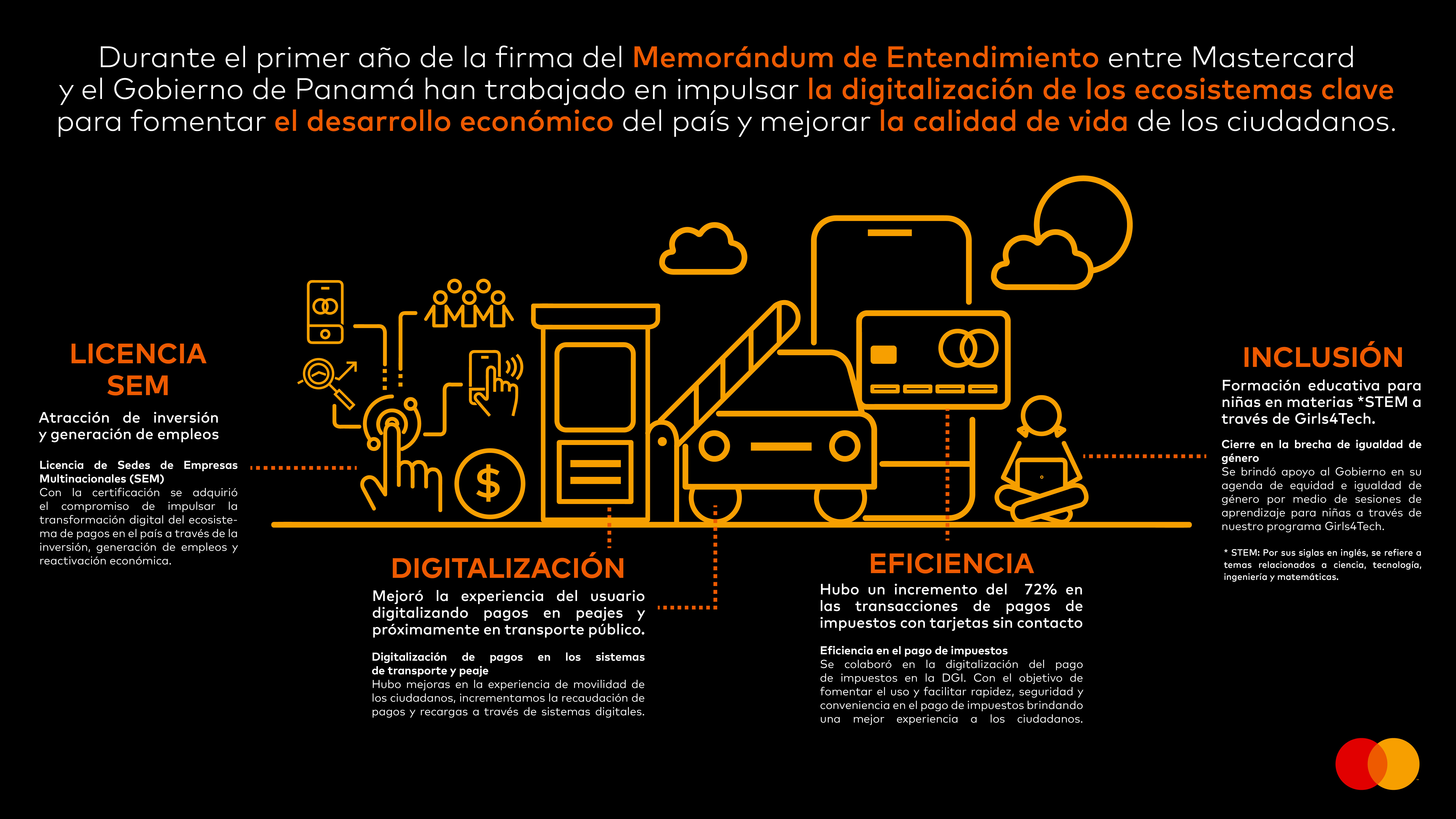 - Digitalización del sistema de transporte: estableció un acuerdo con la Empresa Nacional de Carreteras (ENA), que permite a los usuarios realizar recargas y pagos automáticos a través de la aplicación Panapass utilizando tarjetas Mastercard, mejorando así la experiencia de movilidad en los corredores Norte, Sur y Este. Además, Mastercard continúa trabajando en la digitalización de los sistemas de pago en el transporte público como El Metro de Panamá y el Metro Bus.