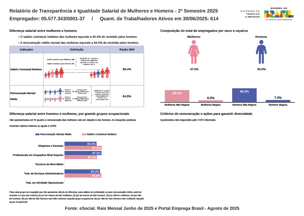 O relatório não compara profissionais na mesma função, não analisa tempo de serviço na organização e na respectiva função, bem como não considera diferenças de desempenho entre profissionais. Estamos certos de que, em uma análise adequada de nossos dados, não há diferenças salariais injustificadas entre nossos profissionais. De qualquer forma, em observância à legislação e ao nosso compromisso com a transparência, publicamos abaixo o relatório do MTE.
