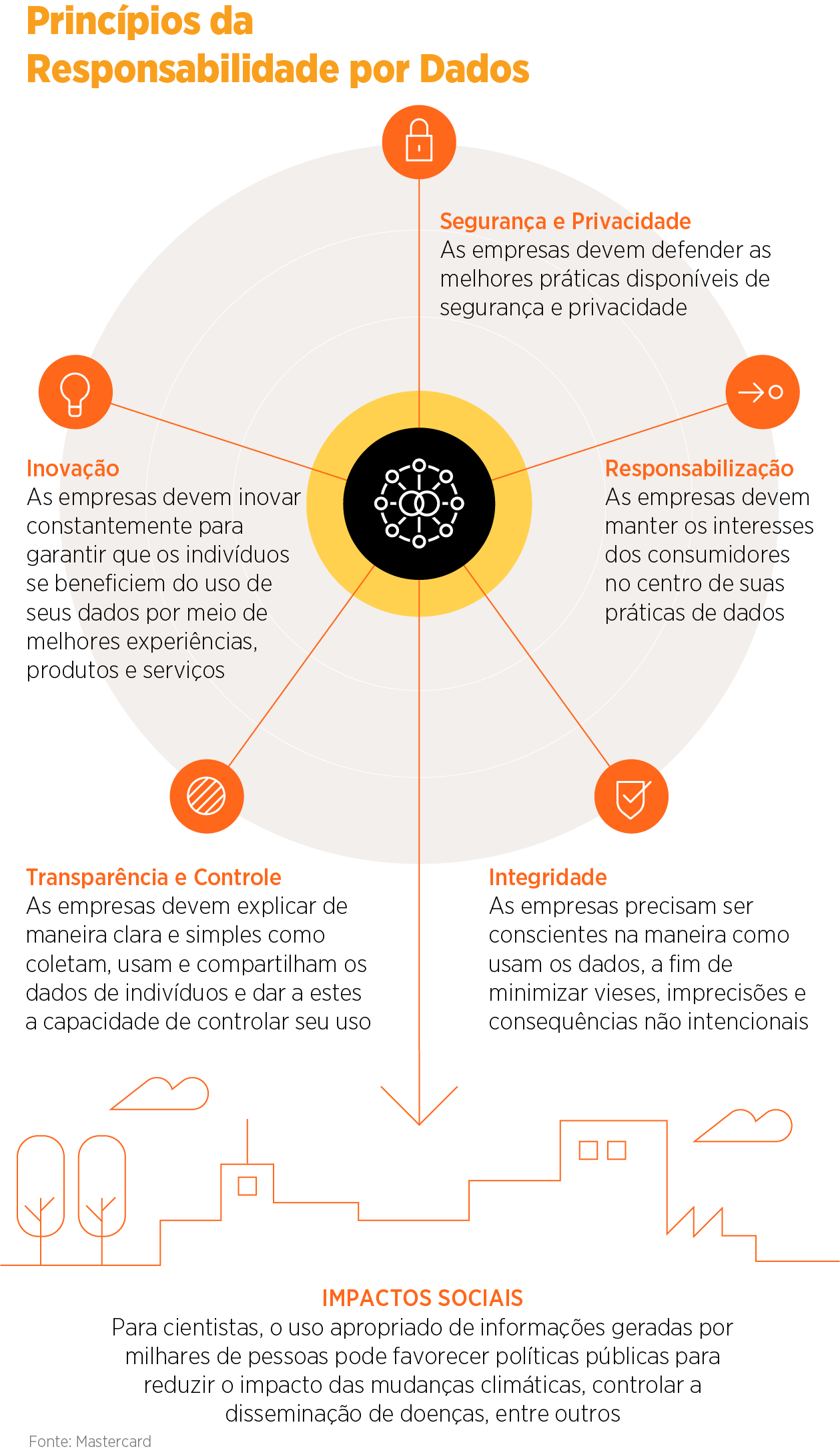 Para contemplar a preocupação das pessoas e lidar de forma ética com as informações a que tem acesso, a Mastercard estabeleceu um código internacional de responsabilidade de dados (“data Responsability Imperative”, em inglês) com uma série de princípios que orientam desde a coleta até o gerenciamento e o uso de dados.