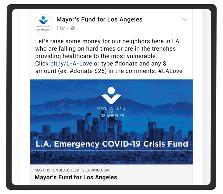 Raising money requires reaching as many potential donors as possible. In this situation, those donors would be Angelenos who are stuck at home, yearning to help their community. “Since the city is sheltering in place, people are now very connected to social media and watching TV,” explains Paslar. “We felt it was important to be where these audiences are.” She worked with fintech partner Goodworld, which facilitates hashtag donations through social media, to come up with a system that spanned across social media, text and webpages. Anyone interested in contributing need only text LALOVE to the number 21000.