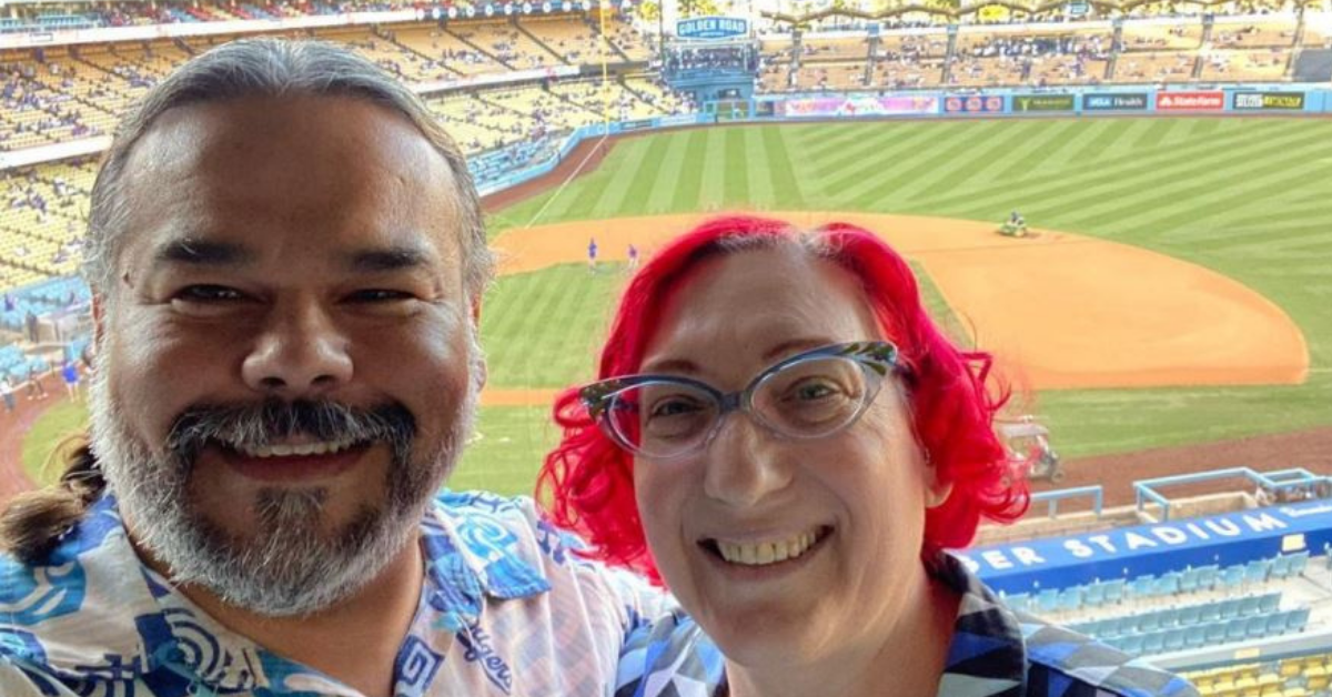 Wes Avila and his wife and business partner Tanya Mueller at Dodger Stadium, celebrating their win in the Home Team Advantage Small Business Contest, presented by Mastercard and MLB.