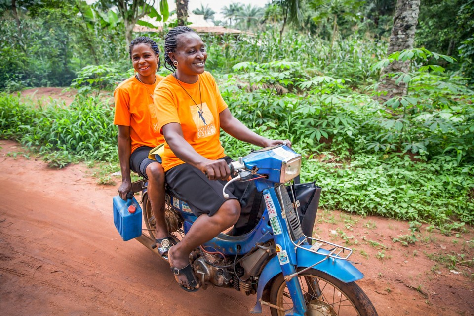 Eucharia Idoko drives her motorbike with fellow entrepreneur Judith Ogbonna in tow. They're on their way to a Solar Sister meeting in Enugu, a city in southeastern Nigeria. (Photo credit: Solar Sister)