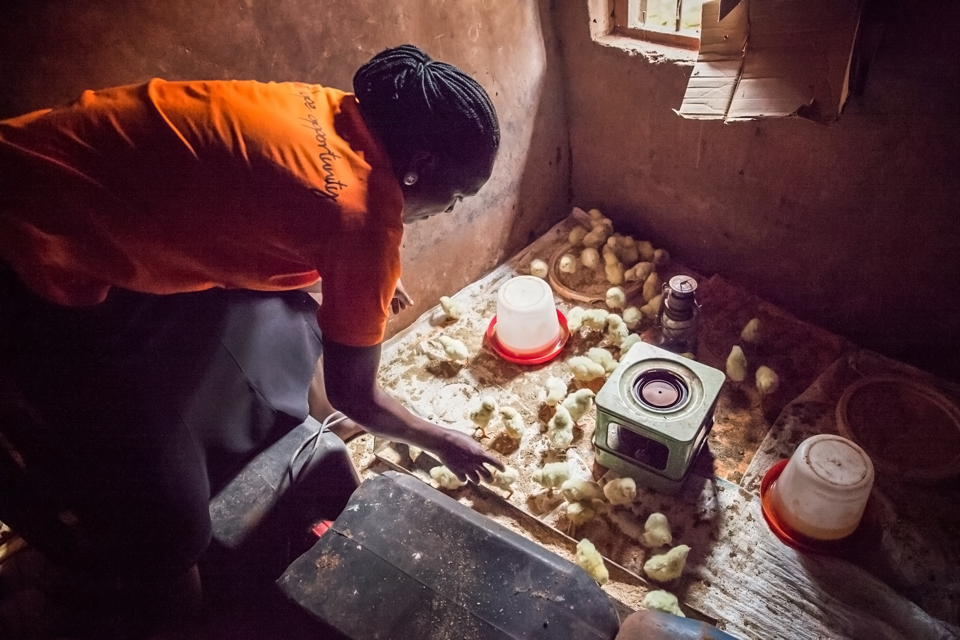 Eucharia Idoko tends to the 50 chicks that she bought with profits from selling solar products. (Photo credit: Solar Sister)