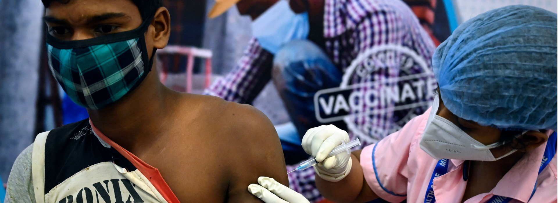 Top banner: A health worker inoculates a construction worker with a dose of the Covaxin vaccine at a shopping mall in Kolkata on June 16. (Photo credit: Dibyangshu Sarkar/AFP via Getty Images)