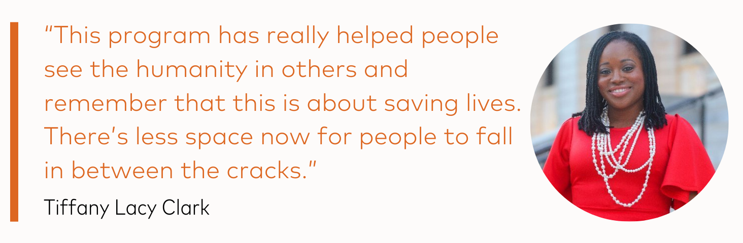 “This program has really helped people see the humanity in others and remember that this is about saving lives,” she says. “There’s less space now for people to fall in between the cracks.”