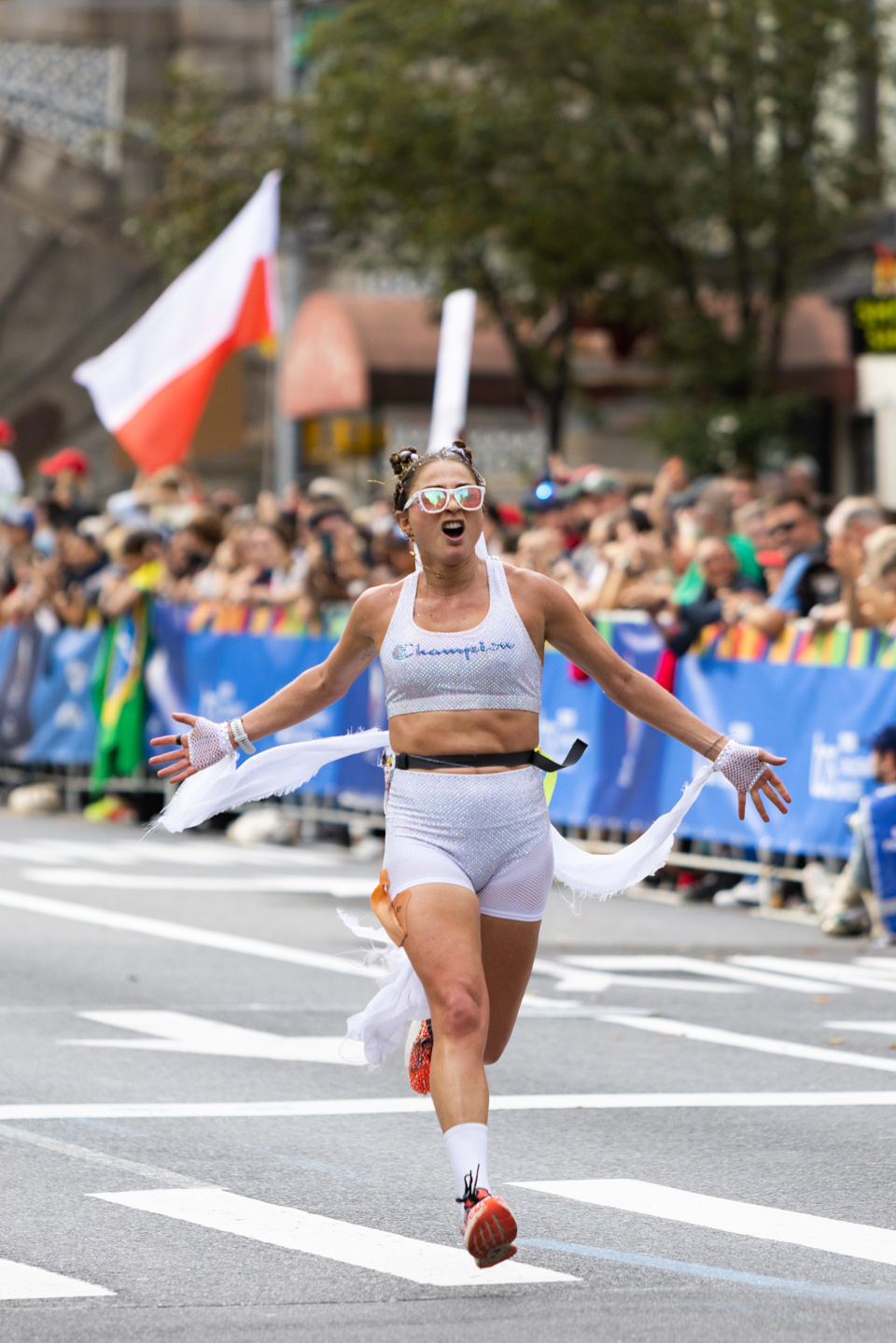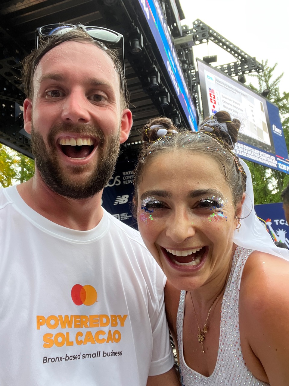 Pappas: I was supposed to run with the elite athletes, about 30 minutes after the Priceless Start, but I had surgery less than a year prior and I wasn’t able to run at their pace … I was just really nervous. I’m going to be alone if I run slower than seven minutes. And my mentor where I live was like, “You gotta do it, this is such a rare opportunity to have the whole streets of New York and all the people, you know, cheering and everything.” And so I hired a makeup designer to put glitter and stars on my face because I wanted to indicate to myself and also to the crowd who might recognize me that it was intentional and I was okay.