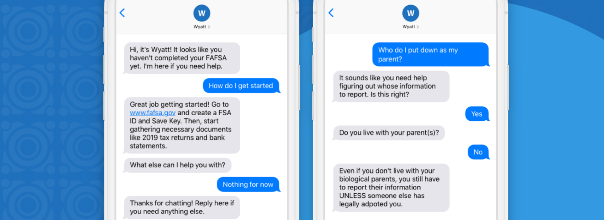 Just as Egbe was getting overwhelmed by the complex process, she received a text from Wyatt. “I was falling behind on filling out the application,” she says. “It told me tips on how to check my student aid report to see if it has been verified.”