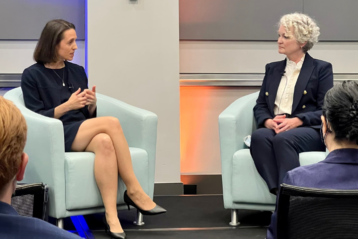 Mastercard's Caroline Louveaux, left, and the World Bank's Tami Dokken at a fireside chat about privacy, trust and data governance in Washington, D.C.